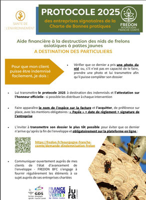 êtes éligibles depuis le 18 Aout 2025 à une aide financière de 50 € (jusqu'à 100 € pour le Jura) pour la destruction de nids de frelons asiatiques, sous réserve de respecter le protocole en vigueur..